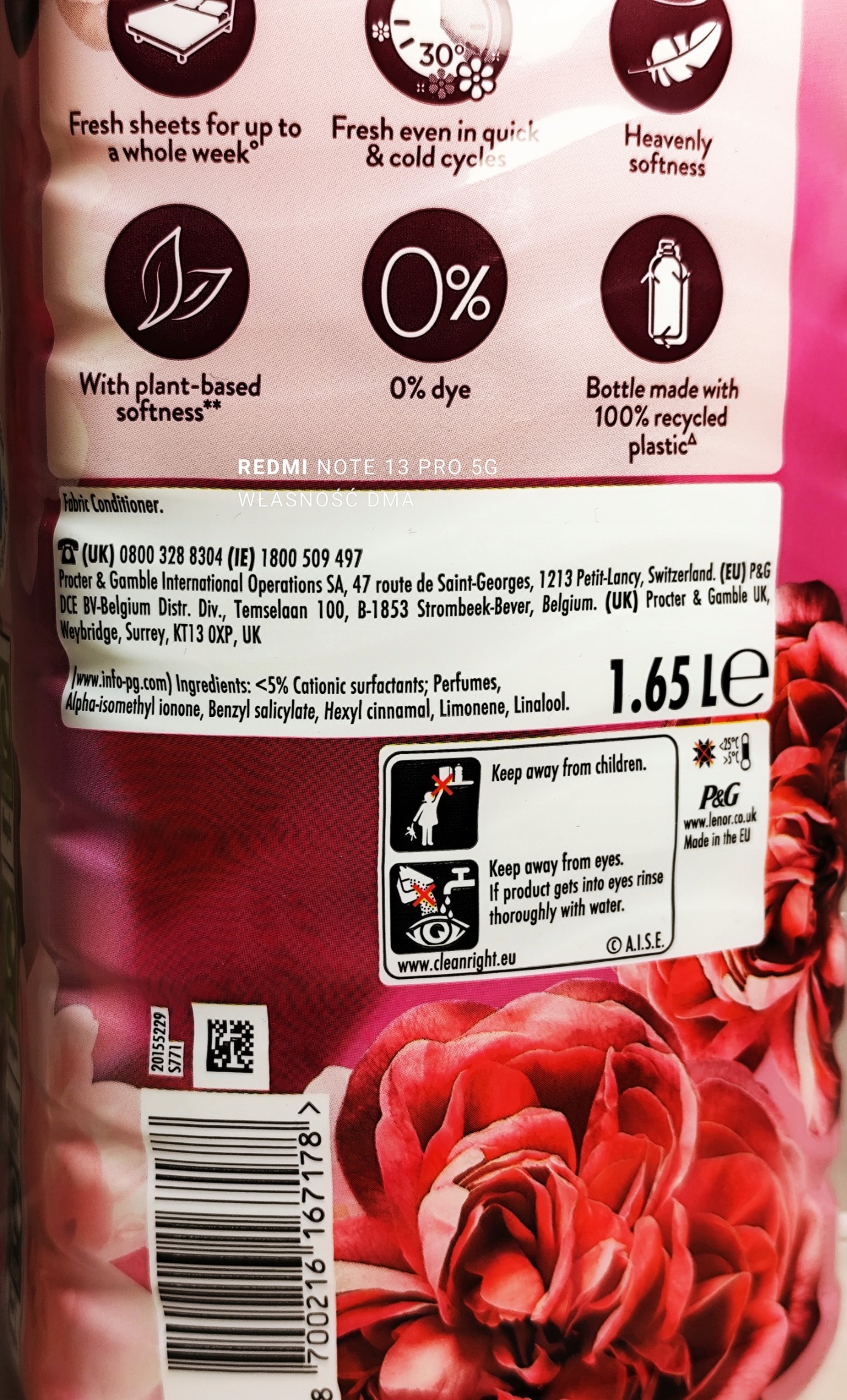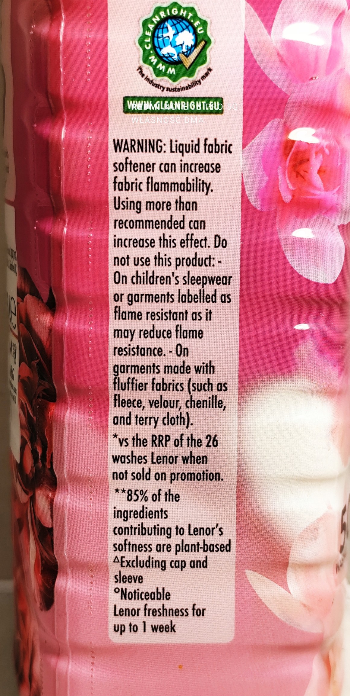 ⭐Ostrzeżenie: Płyn zmiękczający tkaniny może zwiększyć palność tkaniny. Użycie większej ilości niż zalecana może nasilić ten efekt. Nie należy stosować na piżamy dziecięce lub ubrania oznaczone jako trudnopalne, ponieważ może zmniejszyć odporność na ogień. Chronić przed dziećmi. Unikać kontaktu z oczami. Jeśli produkt dostanie się do oczu, przemyć je dokładnie wodą.